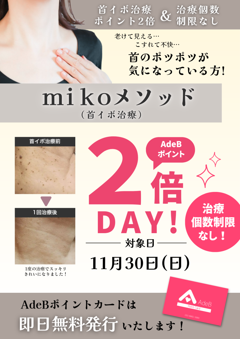 *11月30日(日)のmikoメソッド(首イボ治療)メニューをご予約の上ご来院ください。