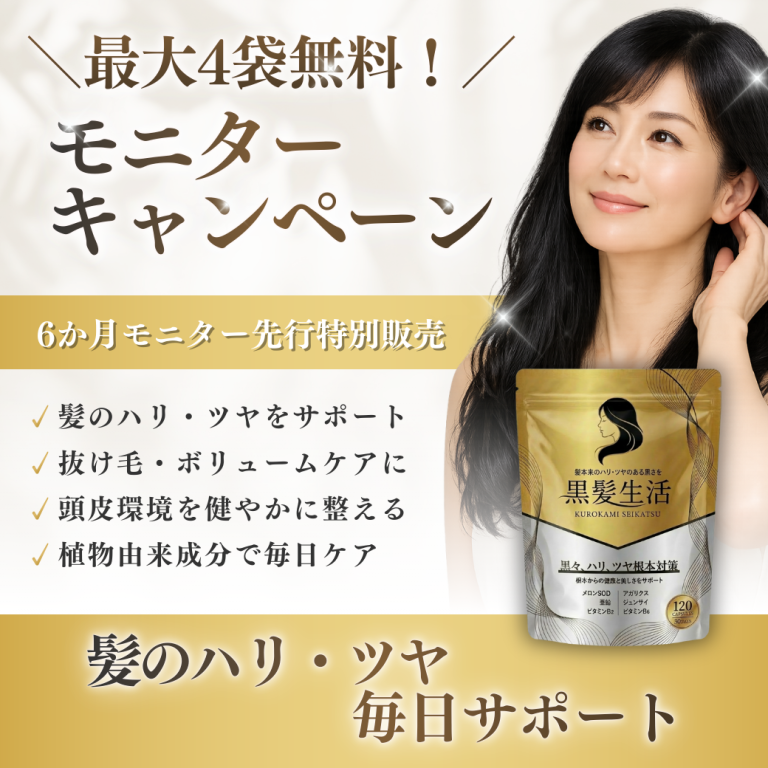黒髪生活は、植物由来成分(メロンSOD・アガリクス・ジュンサイエキス)に加え、ビタミンB群・亜鉛をバランスよく配合した健康食品です。