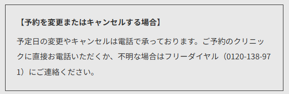 キャンセルは電話で受け付けており、クリニックに直接電話するか、フリーダイヤル(0120-138-971)で対応してもらえます。