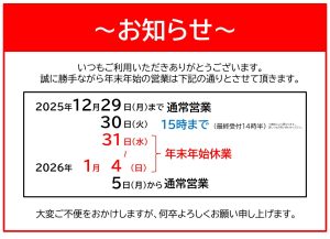 誠に勝手ながら年末年始の営業は下記の通りとさせていただきます。