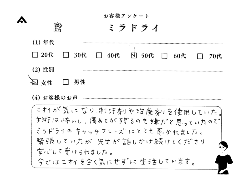 20代女性金額以上のメリットがありました!! 汗やにおいが気にならなくなったのはもちろんですが、脱毛をしてもしぶとく生えていたワキの毛がほとんどなくなりました!!! 一度の治療で二度ラッキー!! 感動です!!!