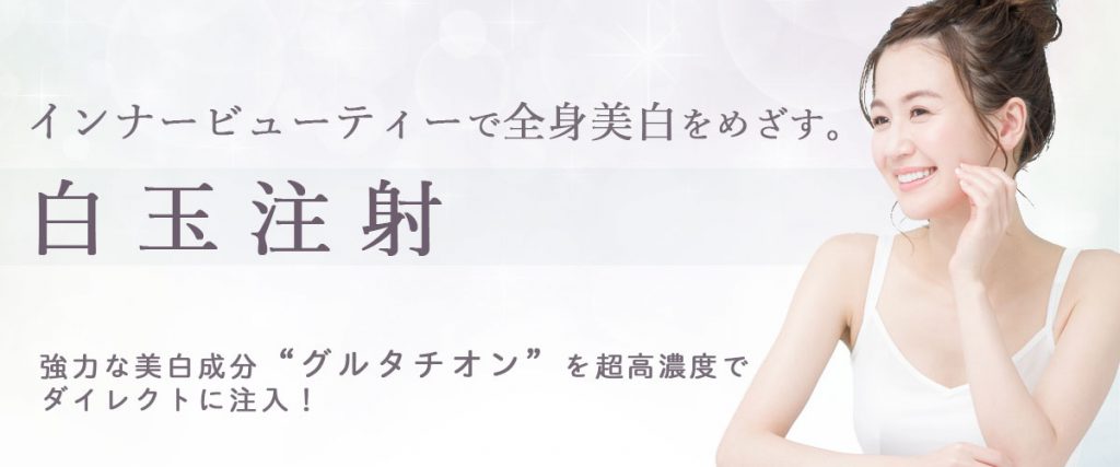 白玉注射とは 白玉注射は美容最前線を行くハリウッドセレブや韓国芸能人から発信され、日本国内においても大人気で、強力な美白成分”グルタチオン”を超高濃度でダイレクトに注入する治療法となっています。グルタチオンには、シミの原因であるメラニンの生成を阻害する作用があると同時に、今あるメラニン自体も減らすことができ、くすみやシミ・肝斑の改善を目指したり、美白効果が期待できます。美白効果以外にも外的要因から受ける刺激からの保護、疲労回復、肝機能改善、生活習慣病予防、抗アレルギーなど健康面において身体の内側から美容と健康をサポートします。 もくじ Toggleこんな方に白玉注射をおすすめします白玉注射で期待できる効果主なリスク、副作用など白玉注射の治療回数白玉注射の予約について こんな方に白玉注射をおすすめします 色白・美肌になりたい方顔だけでなく、体も白くなりたい方肌のくすみが気になる方簡単で日常生活に支障のない治療を望む方誰にも気付かれず治療をしたい方老化が気になる方紫外線が気になる方日焼けを気にしている方お酒・たばこをたしなむ方 白玉注射で期待できる効果 全身の美白・美肌効果メラニン生成抑制・排出促進デトックス抗酸化(体のサビ取り)シミ・そばかす予防肝機能改善 慢性疲労回復肝斑予防生活習慣病の予防抗アレルギー作用強力な抗酸化作用(エイジングケア効果) 主なリスク、副作用など 注射針を刺した周囲が赤くなることがありますが、極端に目立つことはなくすぐにおさまりますのでご安心下さい。 白玉注射の治療回数 白玉注射は週に1~2回くらいのペースで5~10回くらいの回数の治療を推奨しております。(一回で効果を実感できる方もいるようですが、基本的には効果を実感いただくためには5回以上の治療を推奨しております。) 白玉注射の予約について 白玉注射はご予約不要のメニューです。 カレンダーにて診療可能日をご確認のうえ、直接ご来院ください。 カレンダーはこちら
